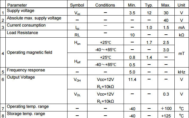 注意3)在將傳感器輸出從H轉換為L時,請確保在設計中施加在傳感器上的磁場低于上述工作磁場(Hoff)。